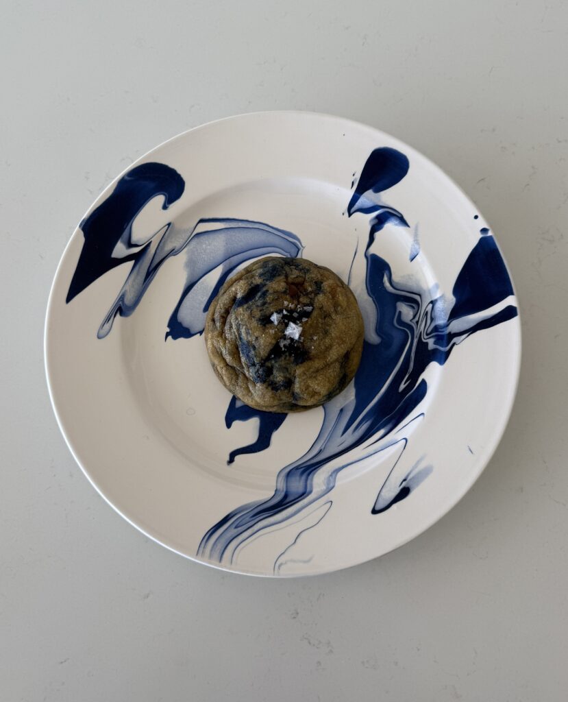 Half dozen original brown butter chocolate chip cookie with organic blue spirulina powder.